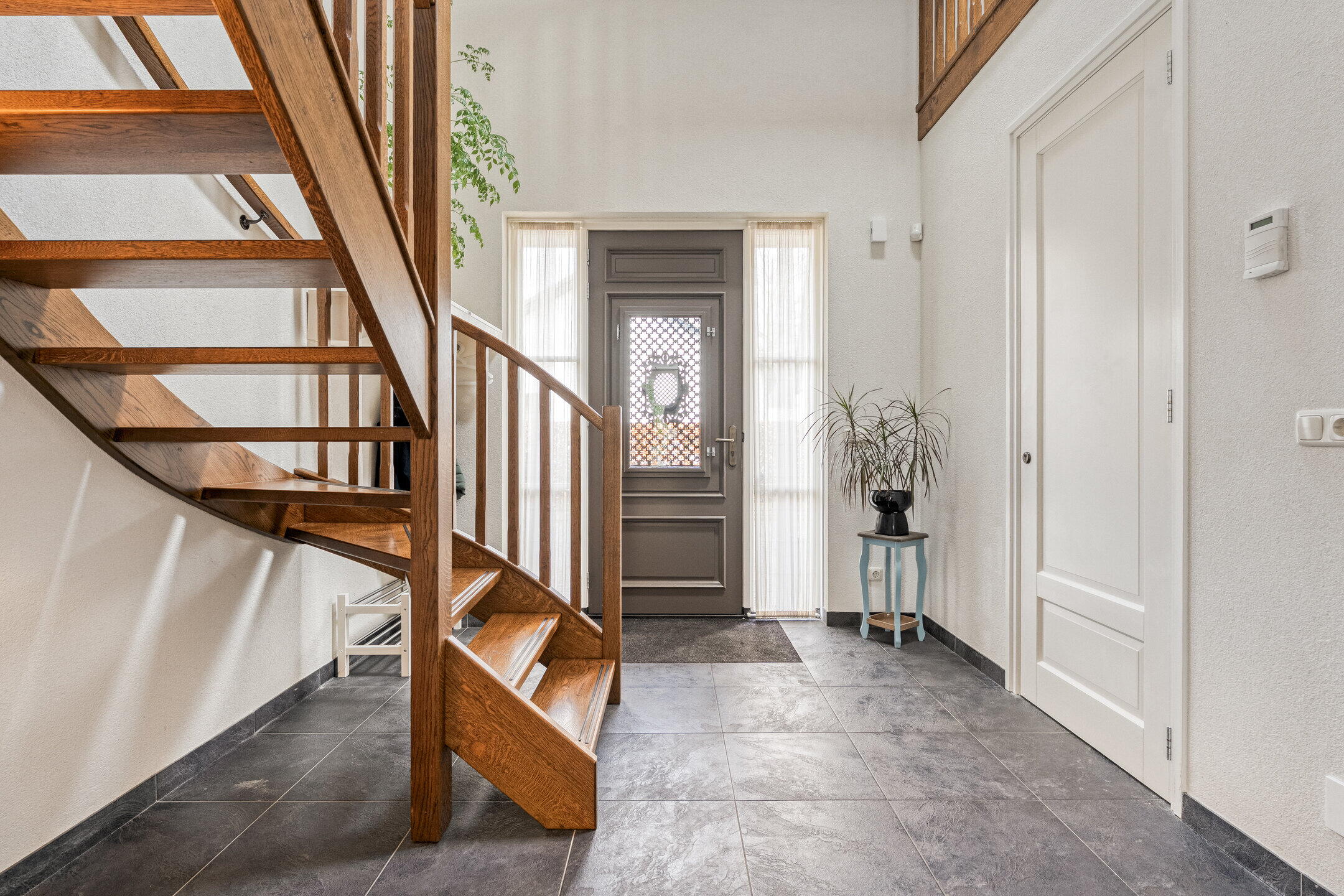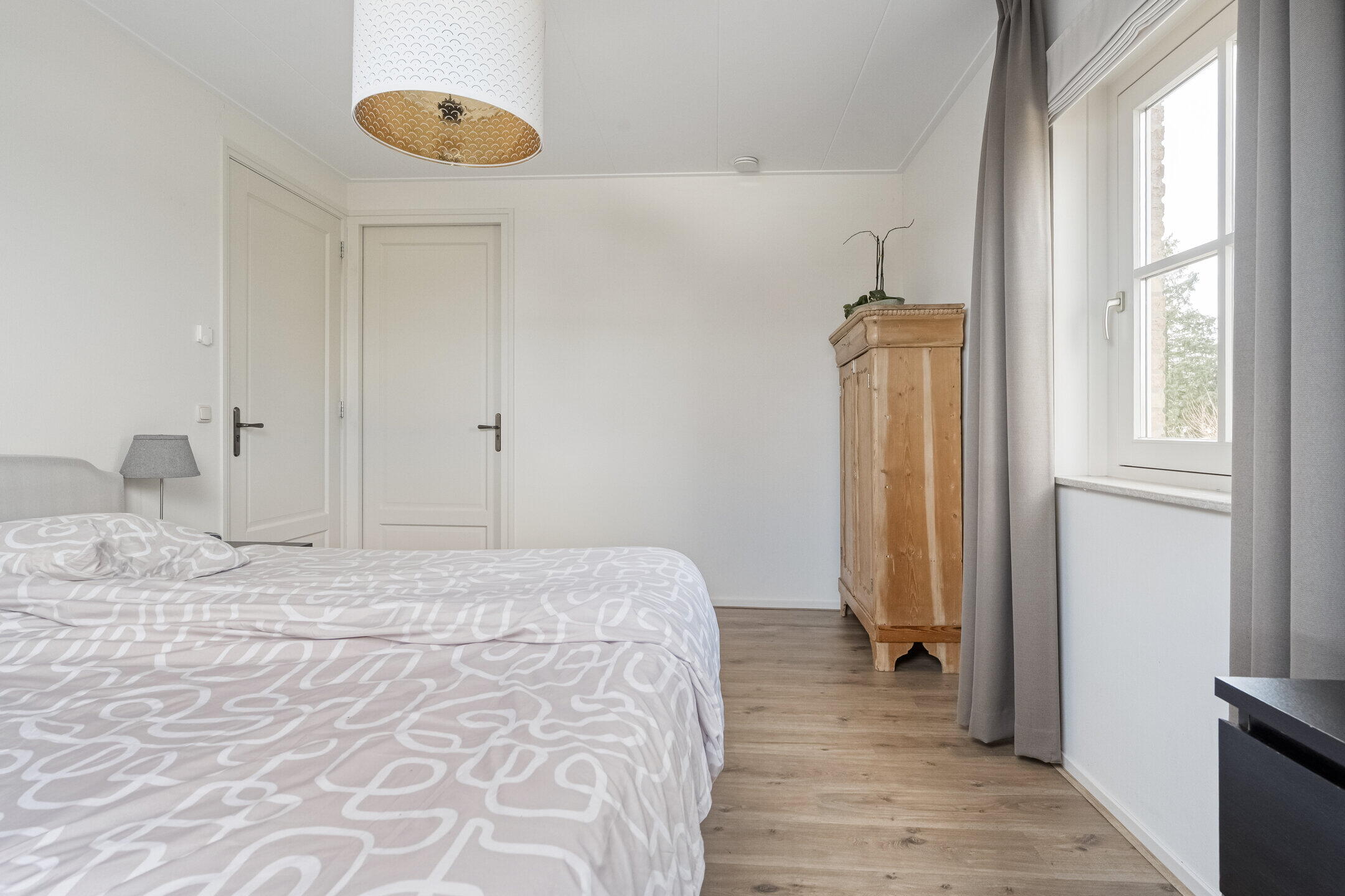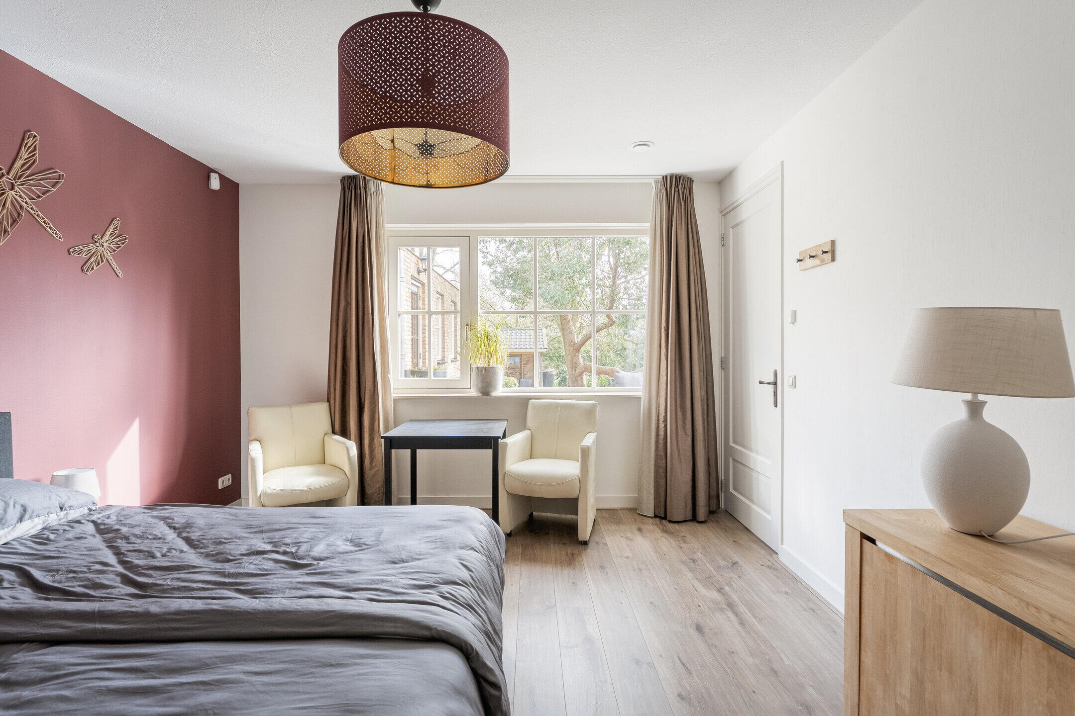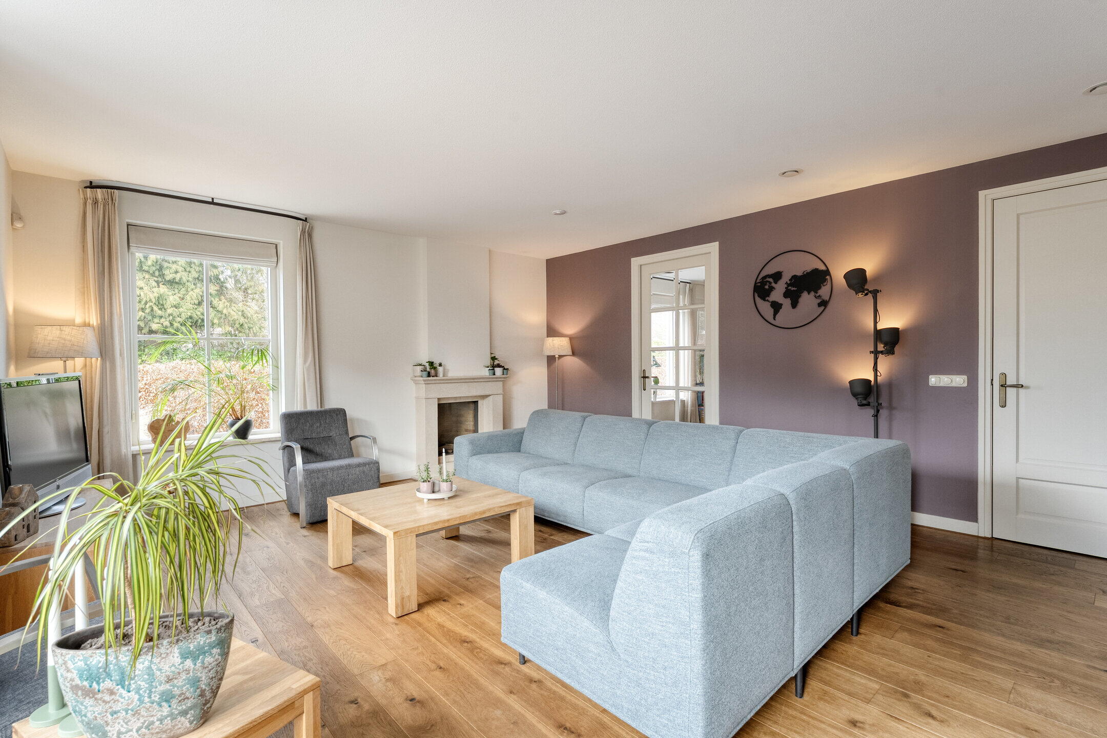 Zijentree met portaal en grote hal met vide en eiken open trap. Toiletruimte met wandcloset, urinoir en fontein. Royale woonkamer met fraaie houten vloer voorzien van vloerverwarming (en koeling), erker en schouw met gashaard, vaste, open kastenwand met en-suite deuren naar de woonkeuken. Aan de voorzijde is een mooie lichte werk- of hobbykamer met gestuct plafond en houten vloer. De royale woonkeuken met eethoek, plavuizen vloer en tuindeuren naar de fraai aangelegde tuin met zonneterras bevindt zich aan de achterzijde. Er is een moderne inbouwkeuken in hoekopstelling met granieten aanrechtblad, koelkast, koffiemachine, combioven, inductie kookplaat en vaatwasser op hoogte. Achtergelegen praktische bijkeuken met extra keukenblok en kastenwand met witgoedaansluitingen en achterdeur naar terras en tuin. Vanuit deze bijkeuken bereikt u de Slaapkamer met aangrenzende luxe badkamer voorzien van inloopdouche, Jet-stream ligbad, dubbele wastafel en wandcloset. Verder is er een infrarood sauna met kleurentherapie.