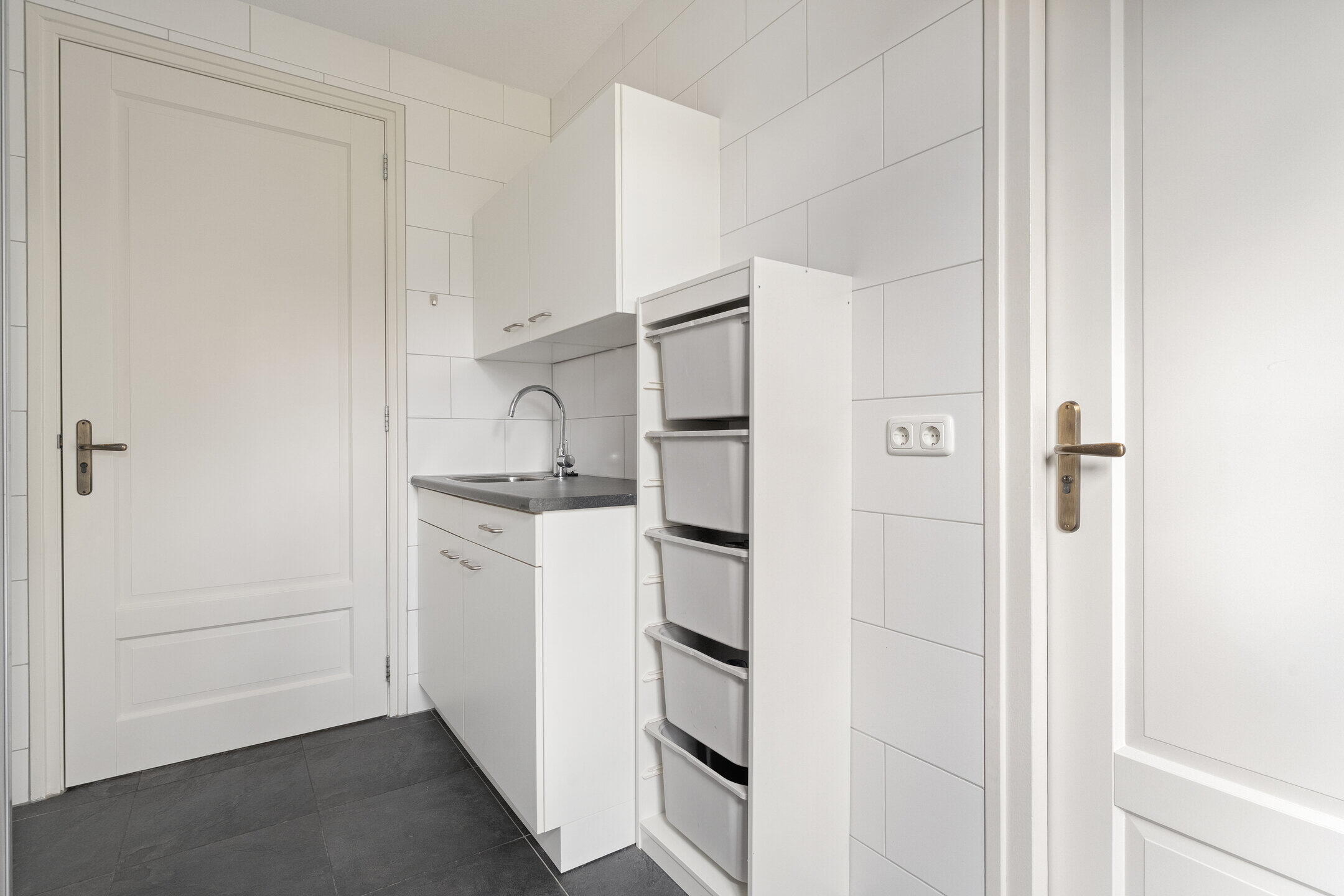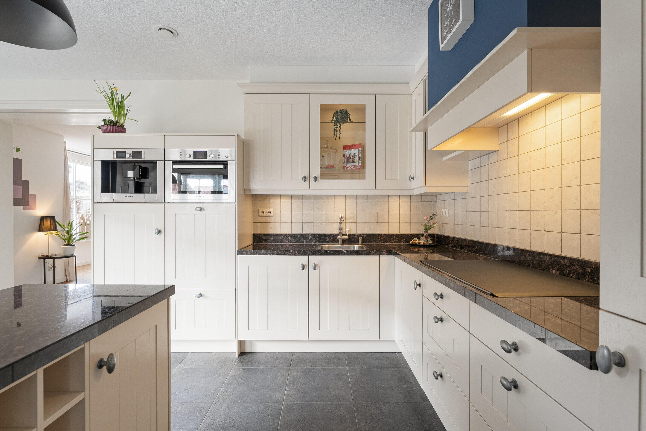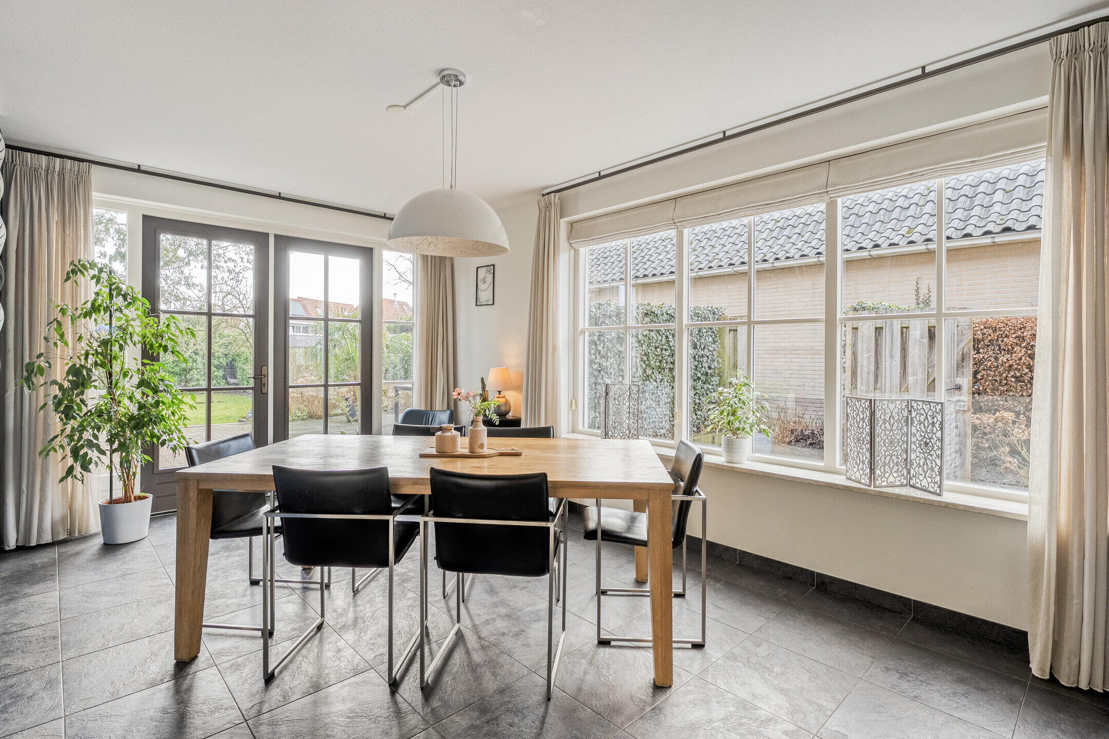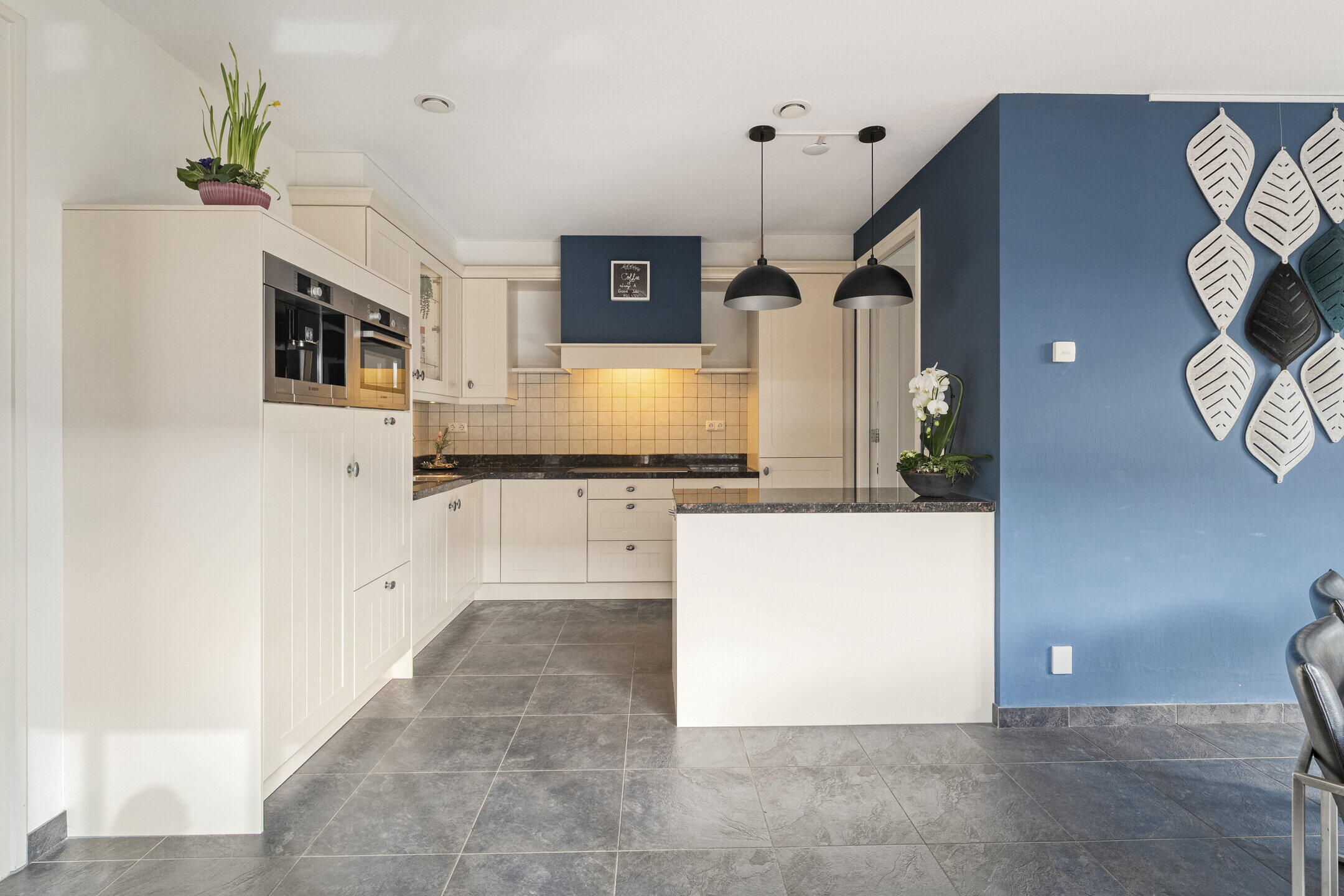Zijentree met portaal en grote hal met vide en eiken open trap. Toiletruimte met wandcloset, urinoir en fontein. Royale woonkamer met fraaie houten vloer voorzien van vloerverwarming (en koeling), erker en schouw met gashaard, vaste, open kastenwand met en-suite deuren naar de woonkeuken. Aan de voorzijde is een mooie lichte werk- of hobbykamer met gestuct plafond en houten vloer. De royale woonkeuken met eethoek, plavuizen vloer en tuindeuren naar de fraai aangelegde tuin met zonneterras bevindt zich aan de achterzijde. Er is een moderne inbouwkeuken in hoekopstelling met granieten aanrechtblad, koelkast, koffiemachine, combioven, inductie kookplaat en vaatwasser op hoogte. Achtergelegen praktische bijkeuken met extra keukenblok en kastenwand met witgoedaansluitingen en achterdeur naar terras en tuin. Vanuit deze bijkeuken bereikt u de Slaapkamer met aangrenzende luxe badkamer voorzien van inloopdouche, Jet-stream ligbad, dubbele wastafel en wandcloset. Verder is er een infrarood sauna met kleurentherapie.