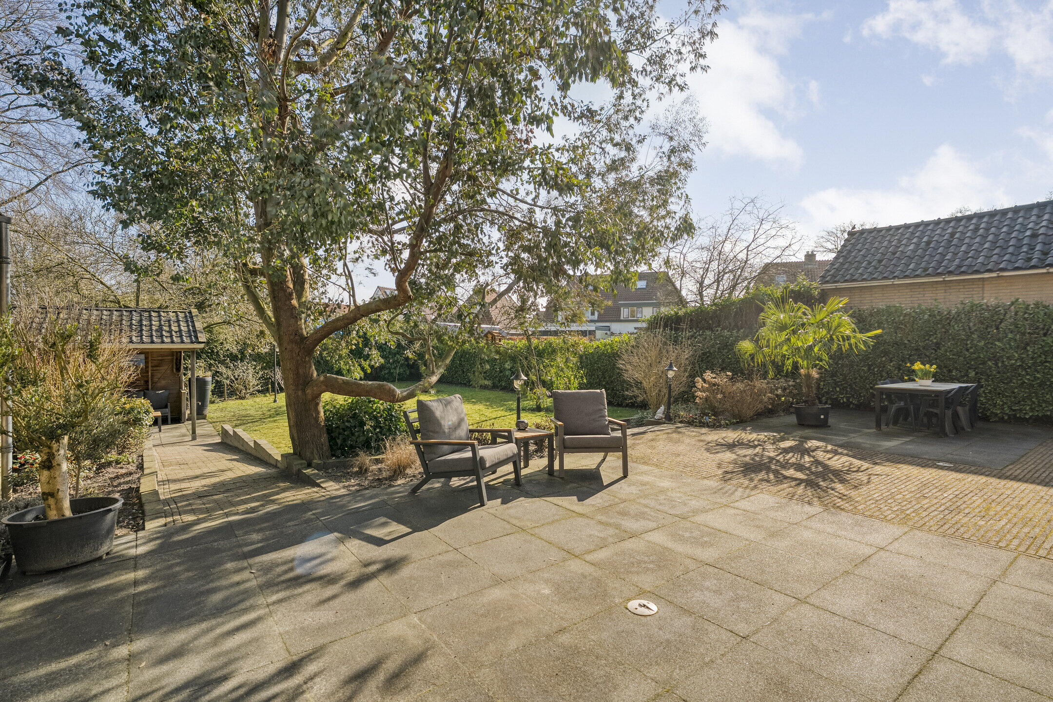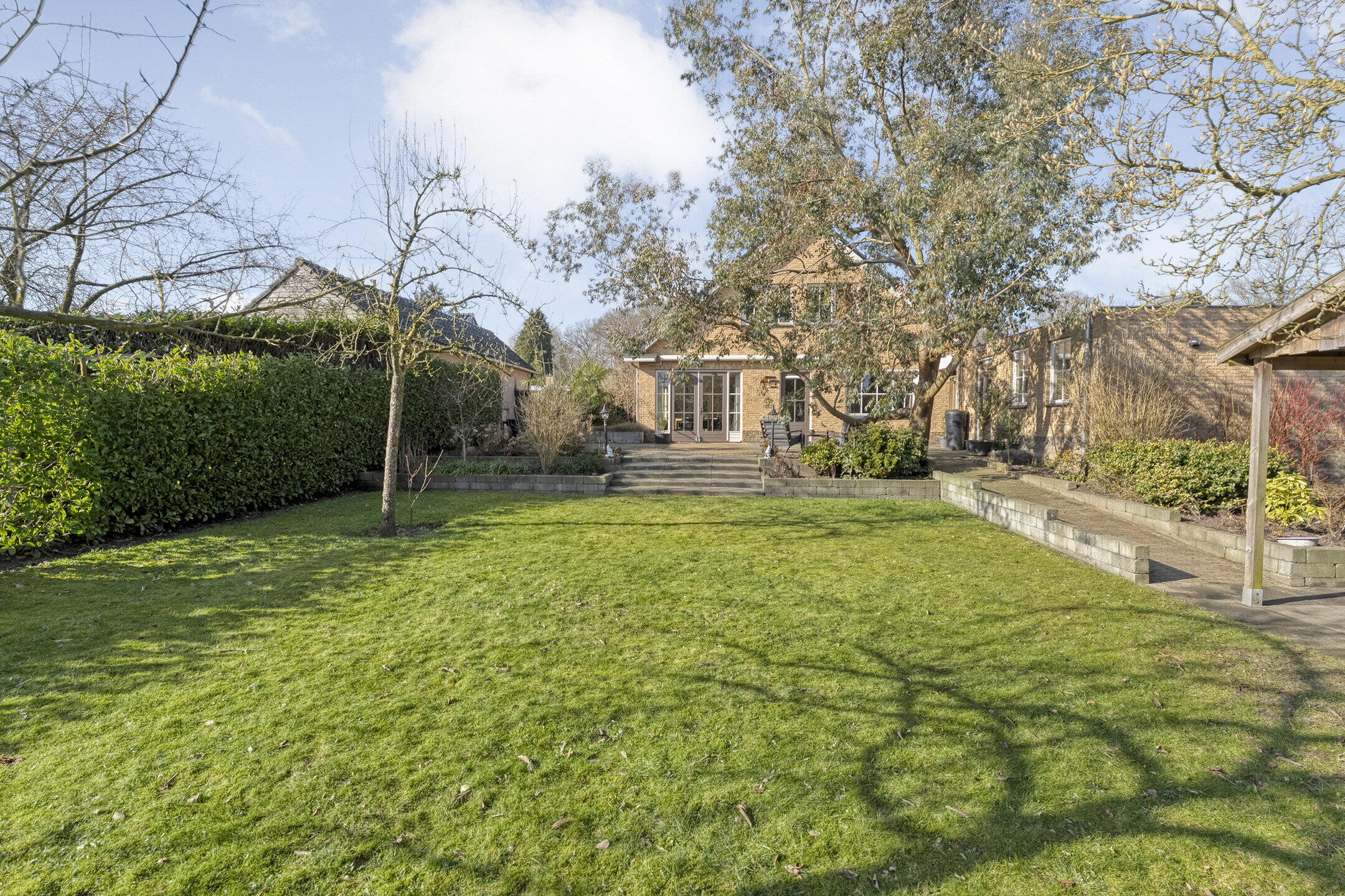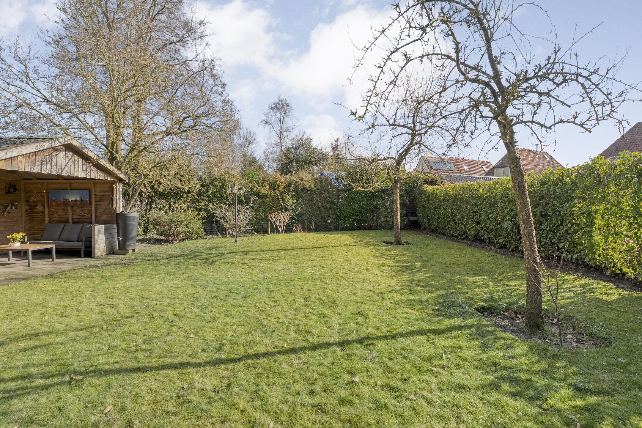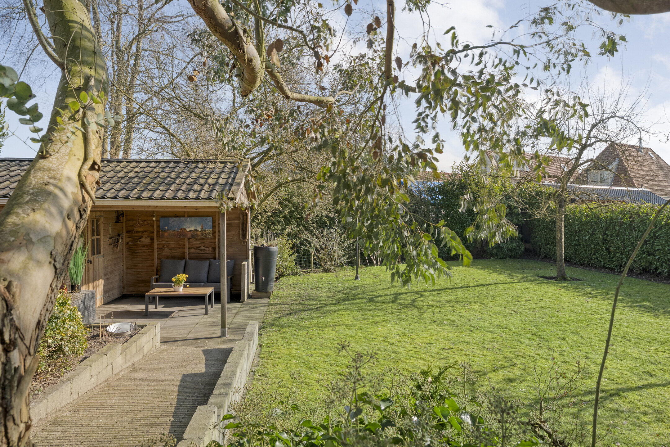 Achter de woning is een diepe en fraai aangelegde tuin met groot terras en houten tuinhuisje met overkapping. In deze keurige tuin gaat rust en privacy hand in hand samen. Het riante terras met zithoek, het grote gazon en de volwassen beplanting met onder andere een magnolia, eucalyptusboom en een appel- en een perenboom zorgen voor een groene en intieme sfeer. De tuin is volledig omsloten door hoge hagen en biedt op elk moment van de dag een zonnige of beschutte plek. Naast de woning is een geïsoleerde stenen garage met vloerverwarming en dubbele deuren en aangrenzende carport.