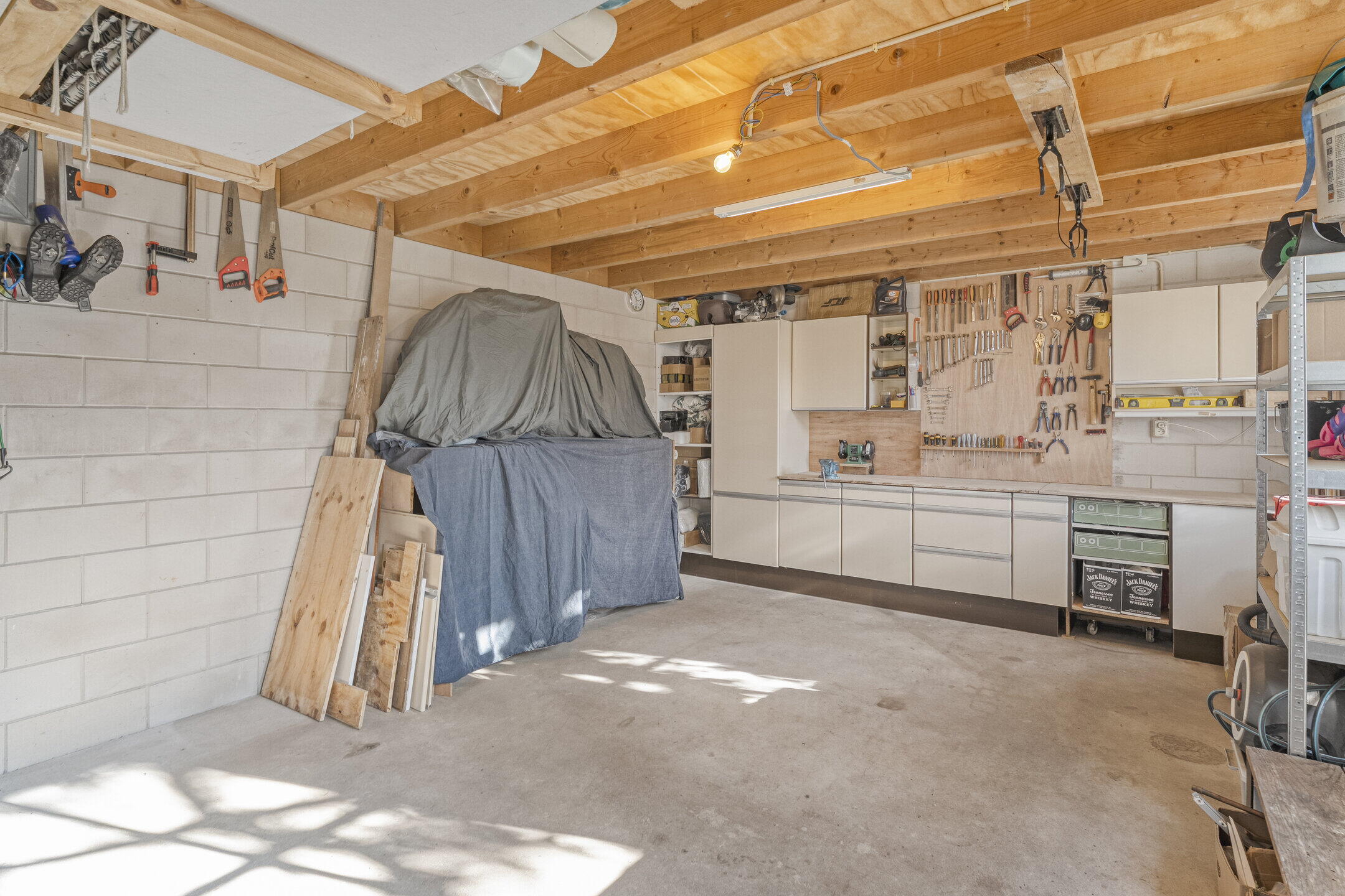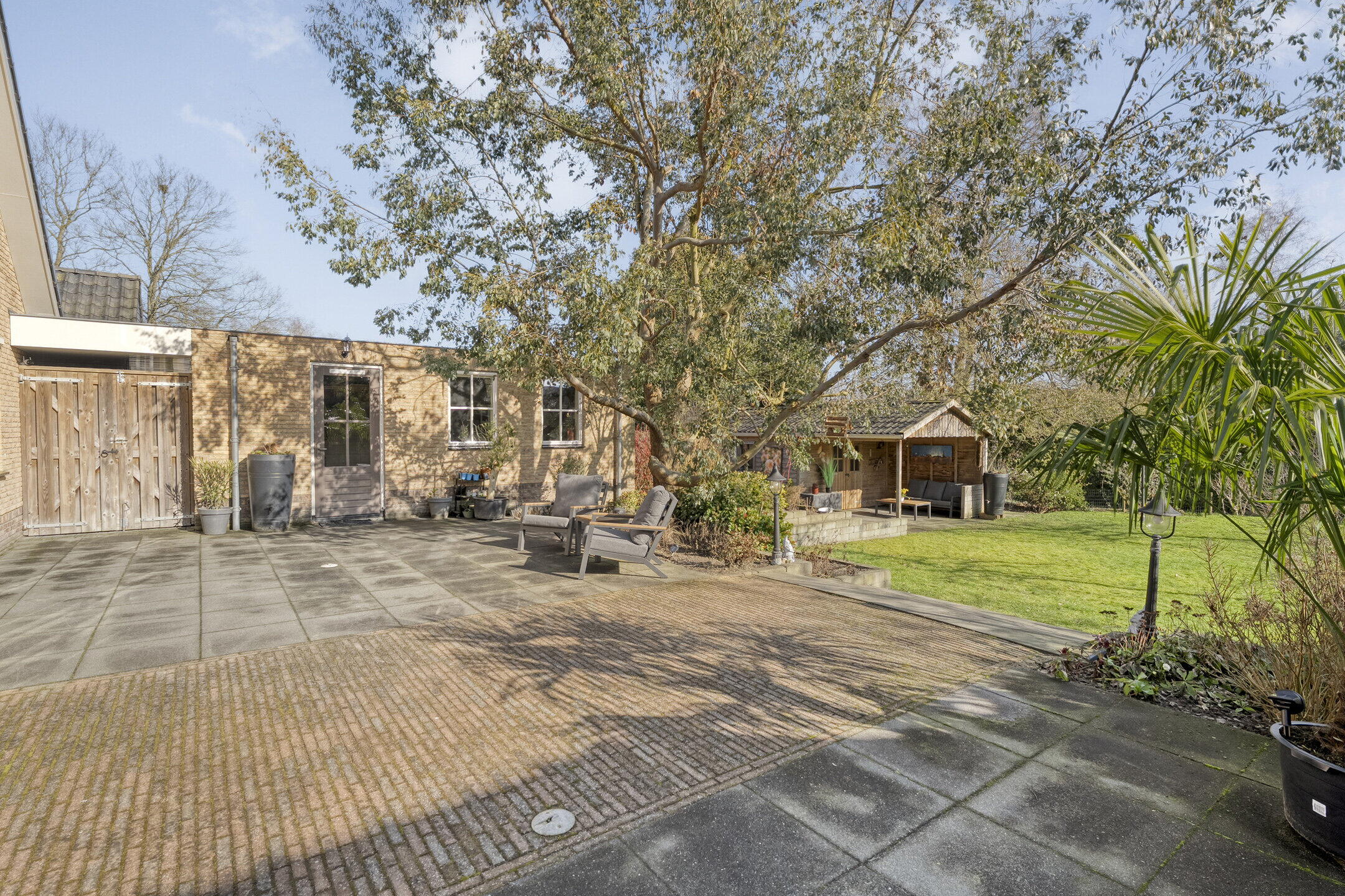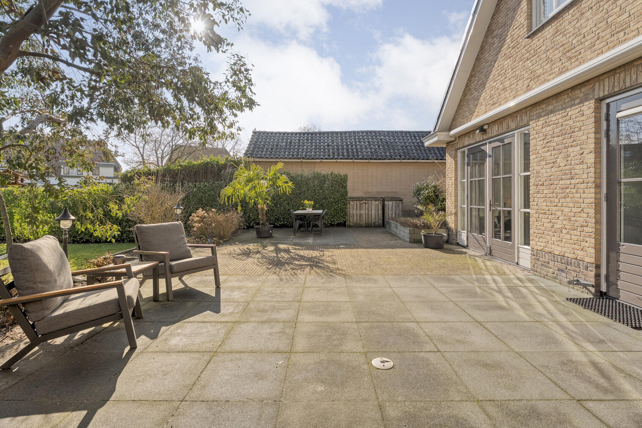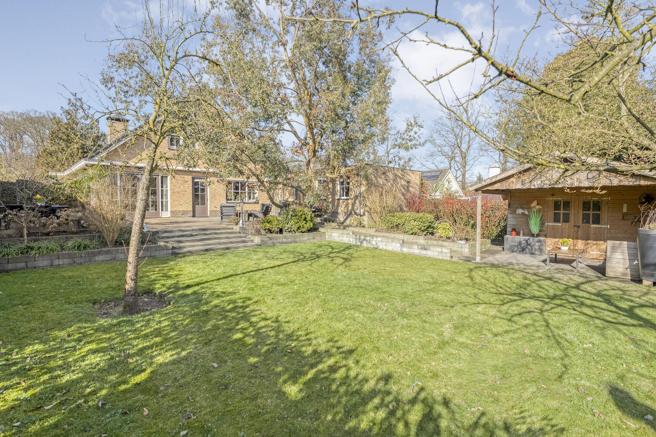 Achter de woning is een diepe en fraai aangelegde tuin met groot terras en houten tuinhuisje met overkapping. In deze keurige tuin gaat rust en privacy hand in hand samen. Het riante terras met zithoek, het grote gazon en de volwassen beplanting met onder andere een magnolia, eucalyptusboom en een appel- en een perenboom zorgen voor een groene en intieme sfeer. De tuin is volledig omsloten door hoge hagen en biedt op elk moment van de dag een zonnige of beschutte plek. Naast de woning is een geïsoleerde stenen garage met vloerverwarming en dubbele deuren en aangrenzende carport.