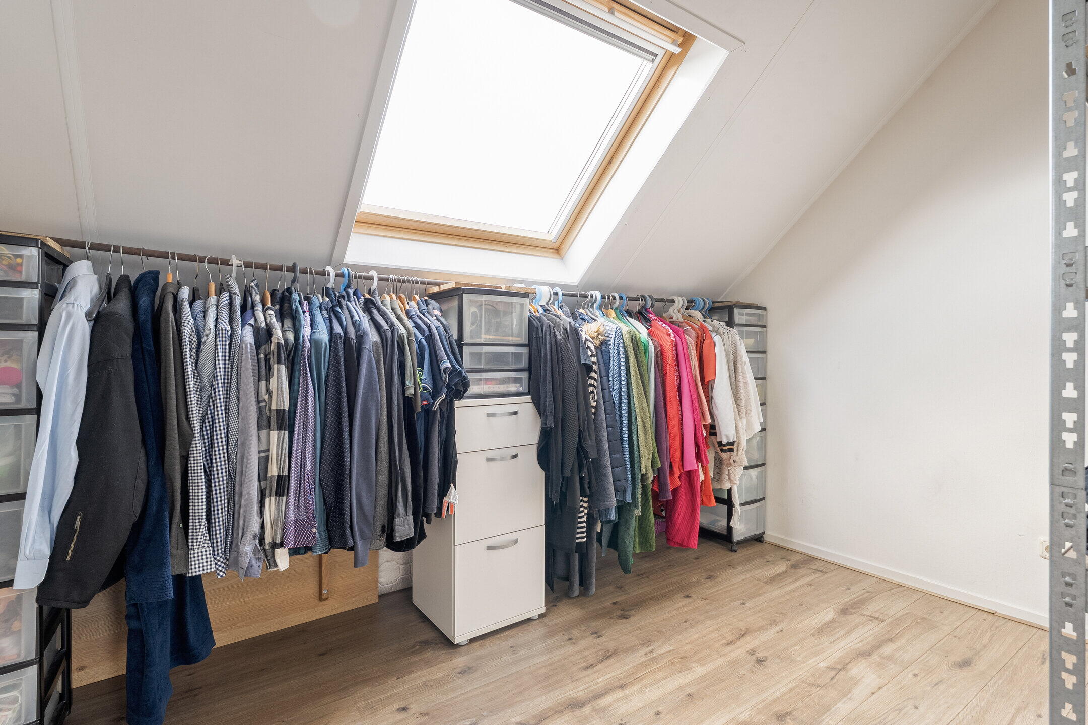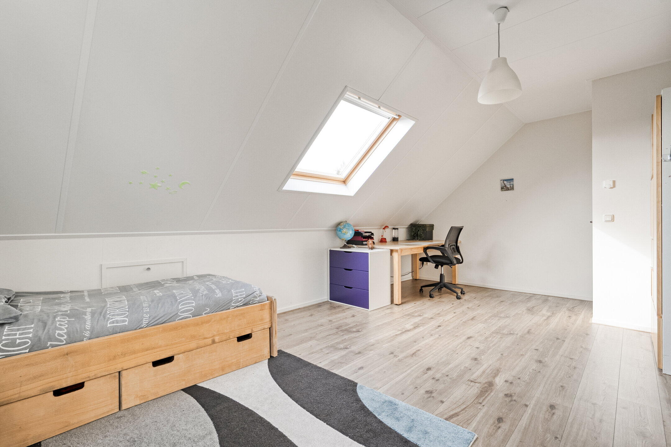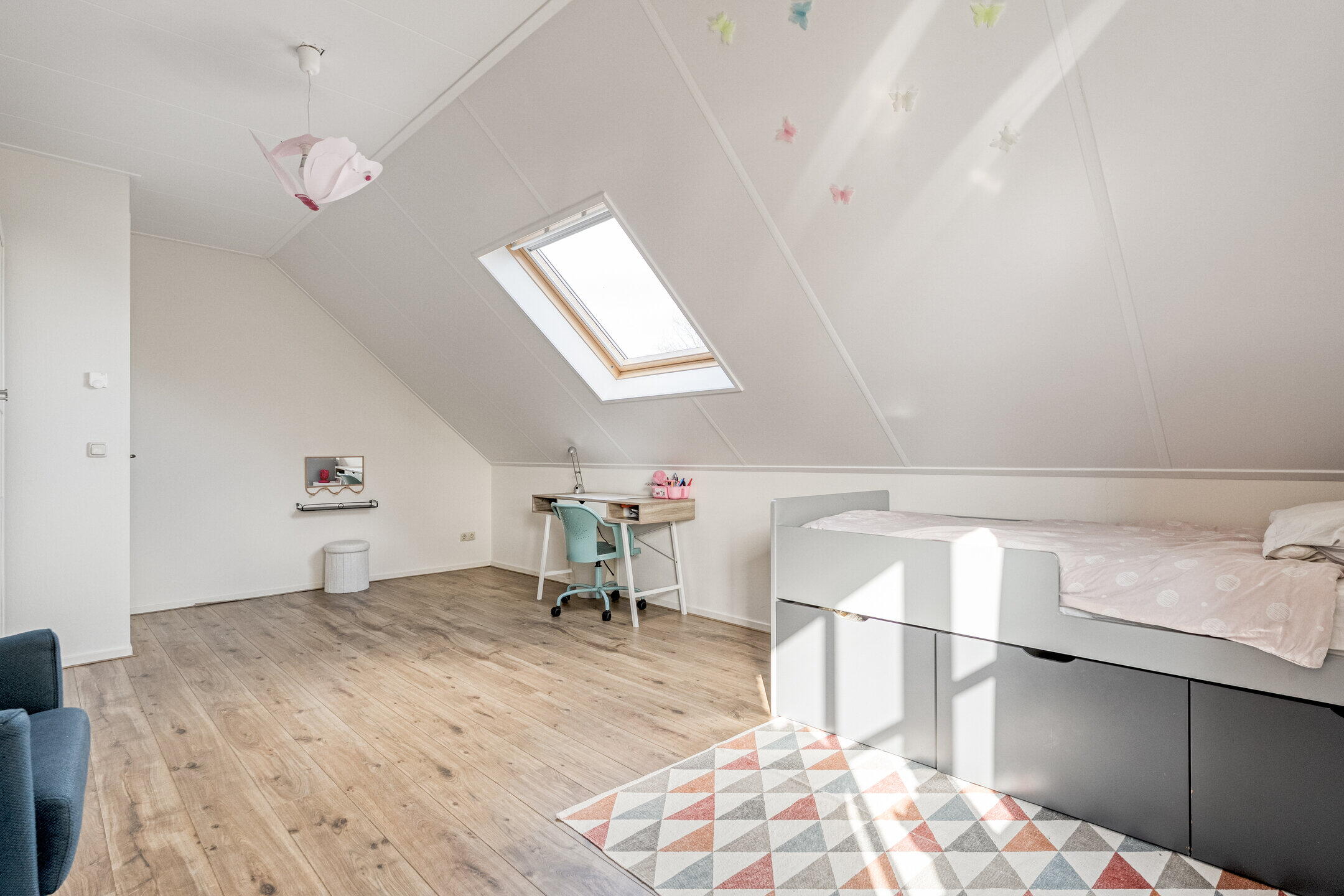 1e verdieping: overloop en entresol met vlizotrap en technische ruimte met WTW-installatie. 3 royale slaapkamers voorzien van fraaie laminaatvloer waarbij de ouderslaapkamer beschikt over een ruime inloopkast met veluxraam. Verder is er een luxe 2e badkamer met douchehoek, dubbele wastafel en wandcloset. Ook deze verdieping is volledig voorzien van vloerverwarming en koeling.